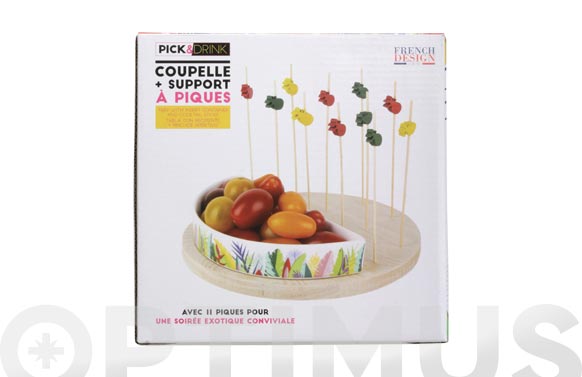 Bol de cerámica, decorado con motivos EXOTIC SAUVAGE, en forma de media circunferencia, con base de madera y 10 pinchos. Ideal para aperitivos, soporte de madera Ø18 cm, bol 3 x 16,5 x 8 cm, Medidas: Ø18, alto 3,7 cm.