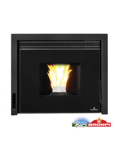 HidroEstufa de Pellets Insertable Bronpi Alpes de 14 kW, alcanza un rendimiento de hasta el 92%-96%, consumo de pellet 1.1-2.9 kg/h, tiene una autonomía máxima de 19 h, peso aproximado 135 kg, capacidad del deposito 21 kg, salida de humo 80 mm de diámetro. Incluye mando a distancia.
