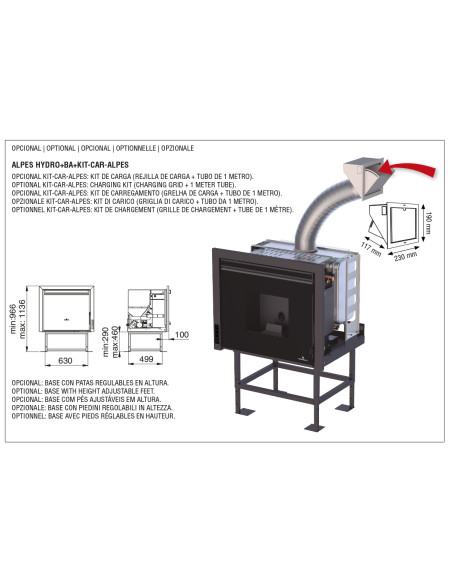Opcional kit de carga con rejilla blanca 23x19 cms. (rejilla de carga + tubo de 1 metro) (Ref. KIT-CAR-ALPES), base con patas regulables en altura (Ref. BA) y perfil inferior del marco para convertirlo a 4 lados (Ref. KIT-MARCO4-ALPES).